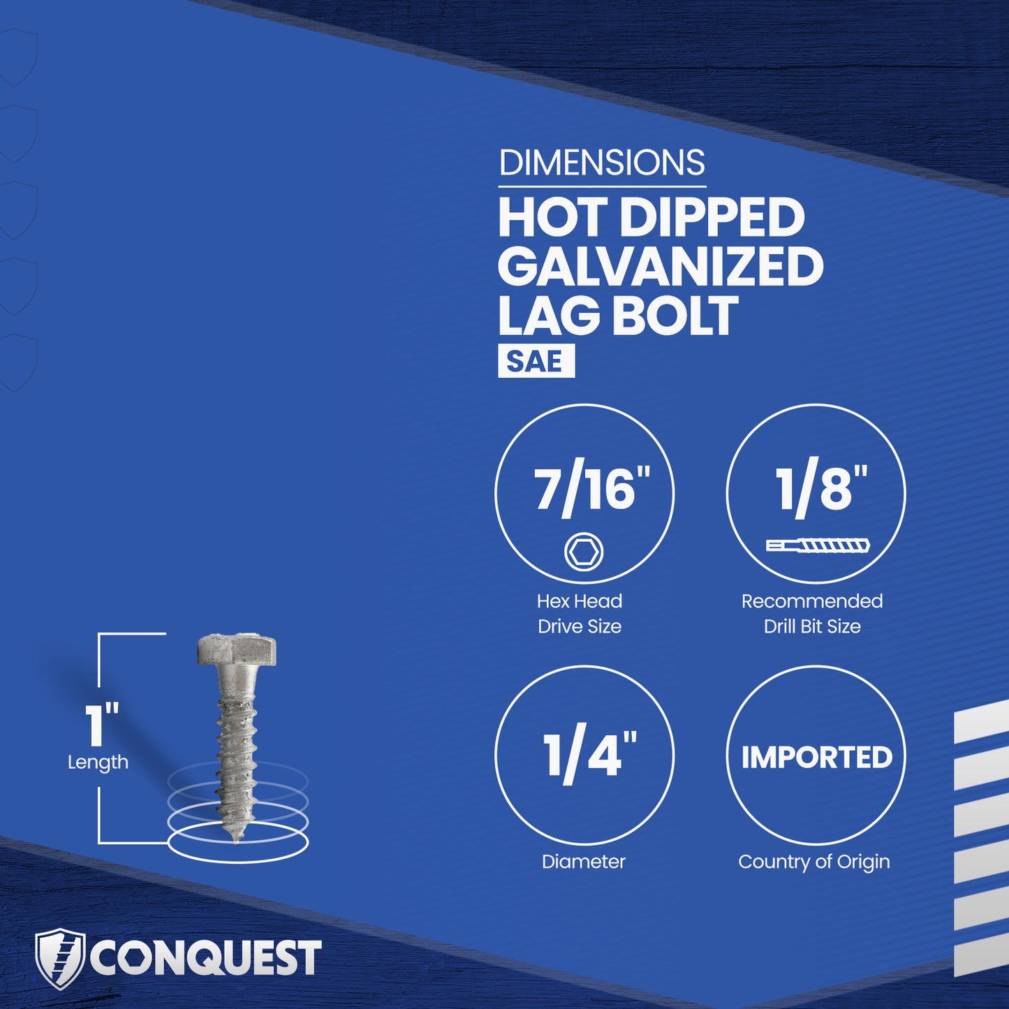 1/4" x 1" Conquest Hex Head Lag Bolt for Wood - Hot Dip Galvanized