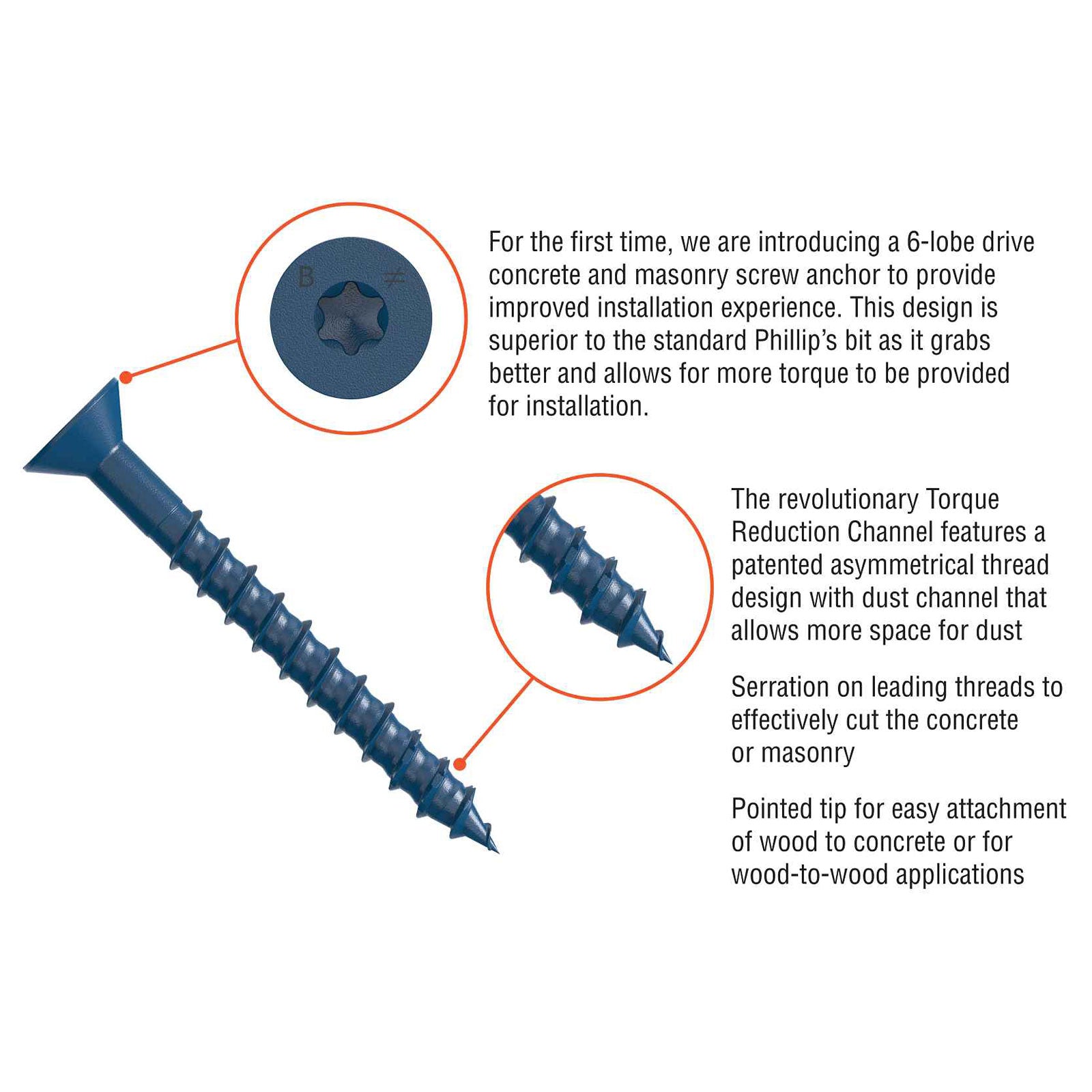 The flat head style sits flush with the surface after installation, making it ideal for countersunk applications like strapping, framing, and fixtures where a clean finish matters. The innovative torque reduction channel captures dust during installation, helping prevent jamming and stripping while keeping thread action clean and smooth.