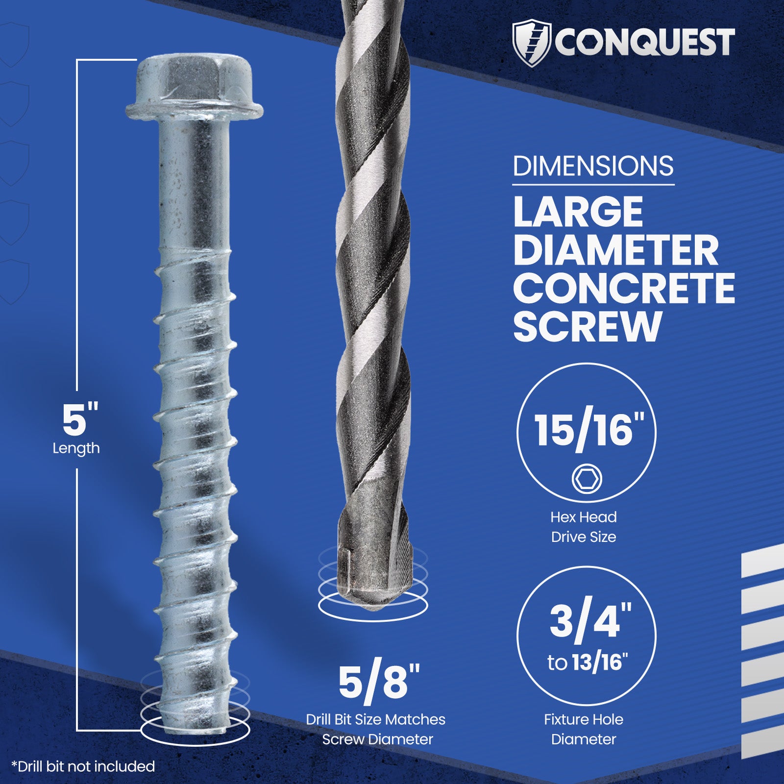 5/8" x 5" Conquest Large Diameter Concrete Screws - Zinc, Pkg 10!